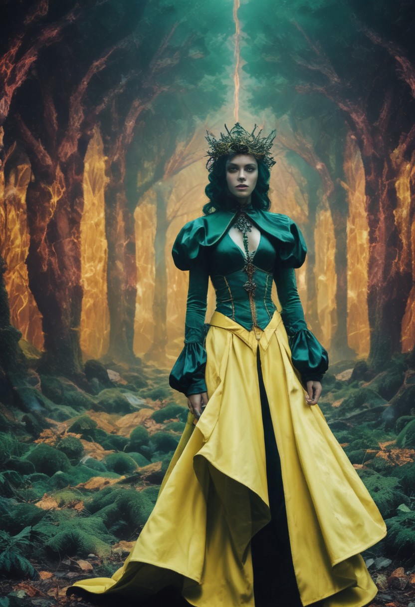dark witch in the style of diana f+, psychedelic tableaux, light yellow and dark green, gothic futurism, bold fashion photography, ethereal figures