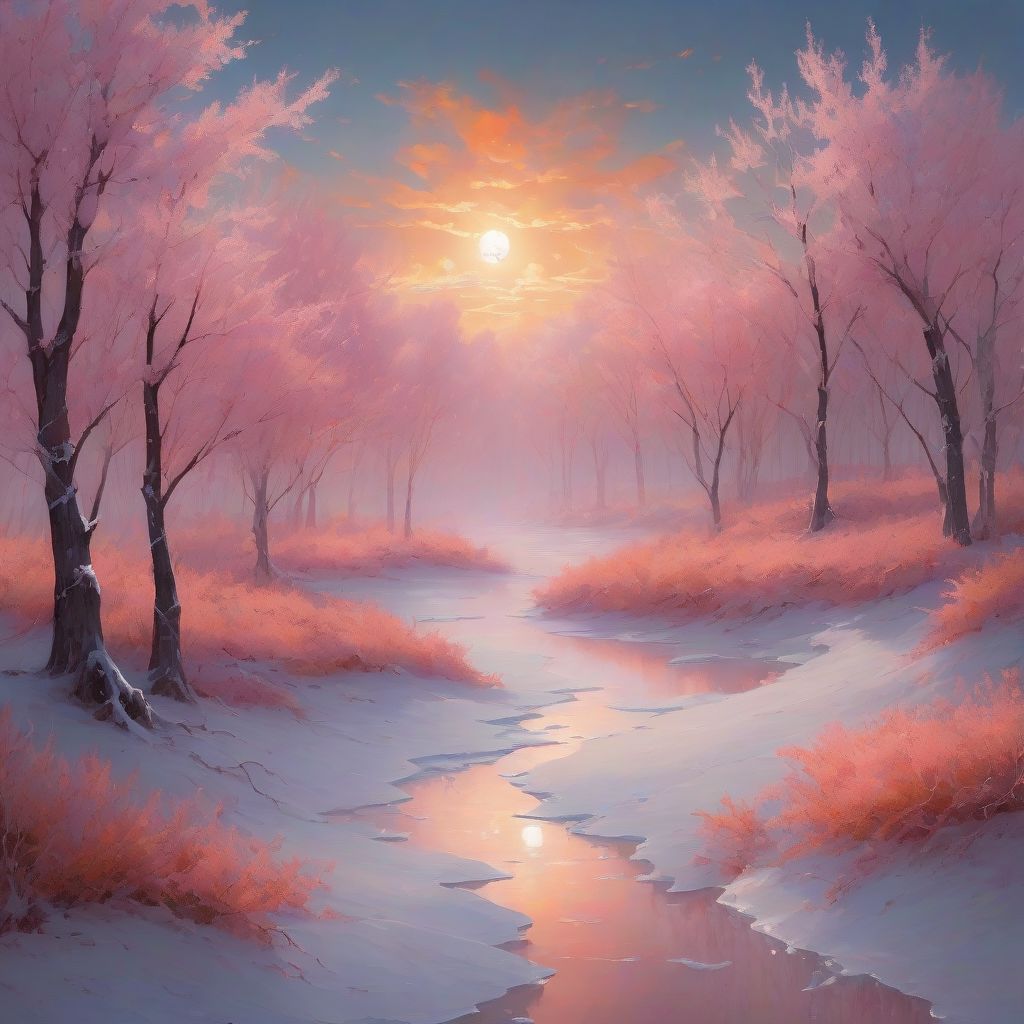 a surreal landscape, where the ground is made of clouds and the trees are made of ice The scene is filled with a sense of other worldliness and intrigue, as the viewer is transported to a world unlike any other. The sun casts a pink and orange glow over the scene, illuminating the delicate ice branches and the billowy cloud ground. The scene is quiet and peaceful, inviting contemplation and reflection.