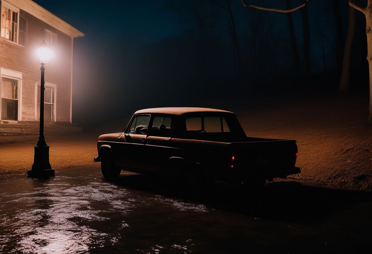 A mysterious exchange under a flickering streetlamp between a lone figure and a stranger at the Trans-Allegheny Lunatic Asylum, with a VW truck in the background, mountains, water, and trees in ink on a white background. Extreme close-up shot capturing colored inner hair and sophisticated natural eyebrow Portrain dark brown. Inspiration from Mackenzie Ziegler for the fashion woman, backlighting effect, Kodak Portra 160 color scheme, unique driftwood sculpture, and Swimwear Sarong in a lightweight cotton with a colorful geometric print. horror scene, knife, dark rooms, glowing eyes, girl, kitchen, gore