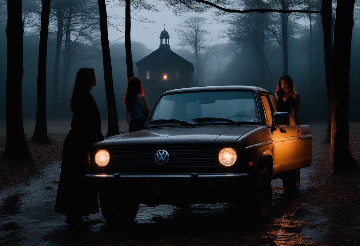 A mysterious exchange under a flickering streetlamp between a lone figure and a stranger at the Trans-Allegheny Lunatic Asylum, with a VW truck in the background, mountains, water, and trees in ink on a white background. Extreme close-up shot capturing colored inner hair and sophisticated natural eyebrow Portrain dark brown. Inspiration from Mackenzie Ziegler for the fashion woman, backlighting effect, Kodak Portra 160 color scheme, unique driftwood sculpture, and Swimwear Sarong in a lightweight cotton with a colorful geometric print. horror scene, knife, dark rooms, glowing eyes, girl, kitchen, gore
