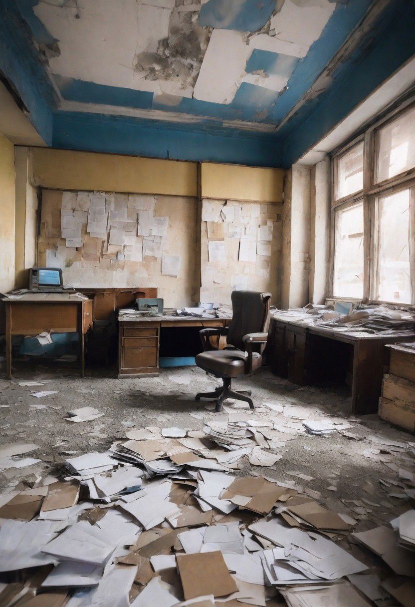 A raw photo, abandoned office, soviet republic, interior, scattered files
