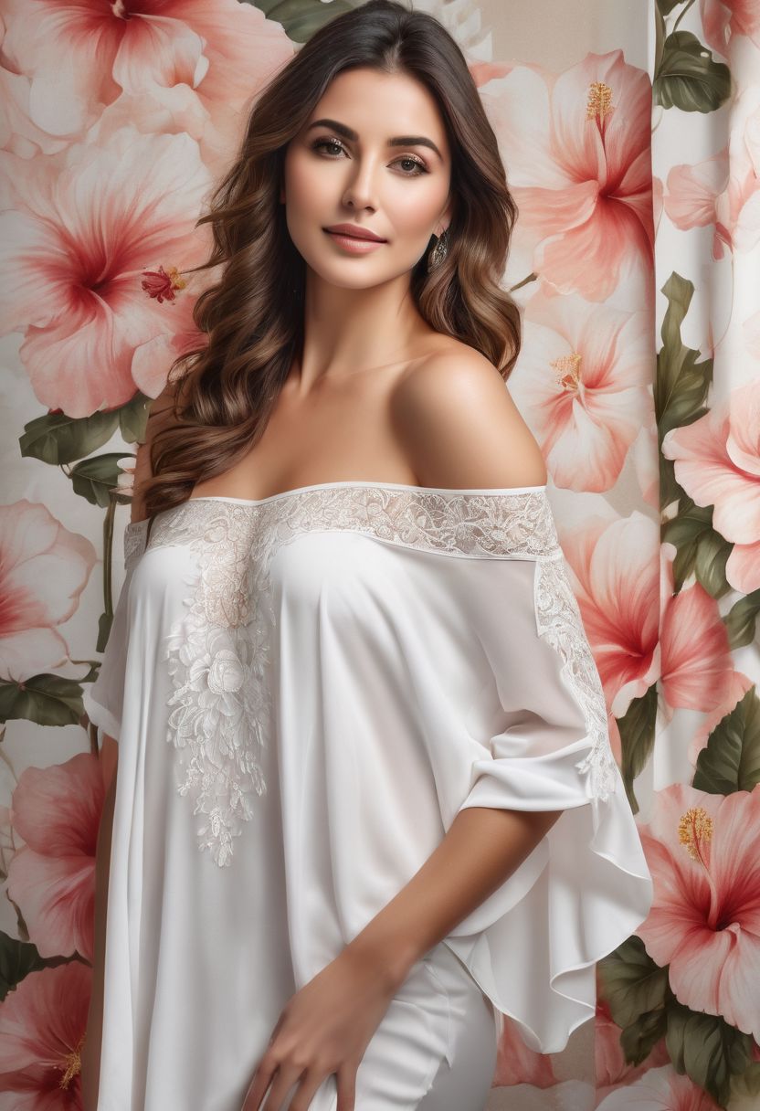 Studio photo of a pretty woman wearing white long shirt, off shoulder, subtle makeup, indoor, intricate elegant, detailed, photometric lighting, symmetric light, best quality, ultra high-res, 8k, background in wallpaper with hibiscus flower photo print, Highly details, masterpiece
