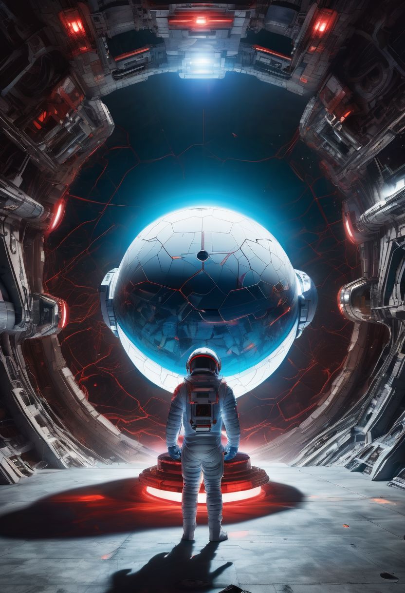large white sphere smooth surface, (blue led lines etched into surface:1.5), glowing large red lens, science fiction, hovering, detailed background, astronaut watching in awe, (size difference:1.3)