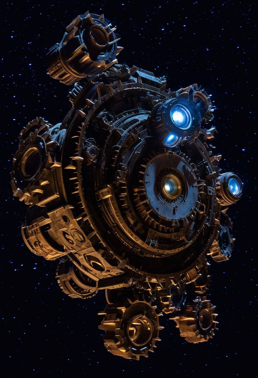 A massive, living gears assembly floating in mid-air, illuminated by a moonless night sky. The individual pieces of the gear troop emit bioluminescent hues,""