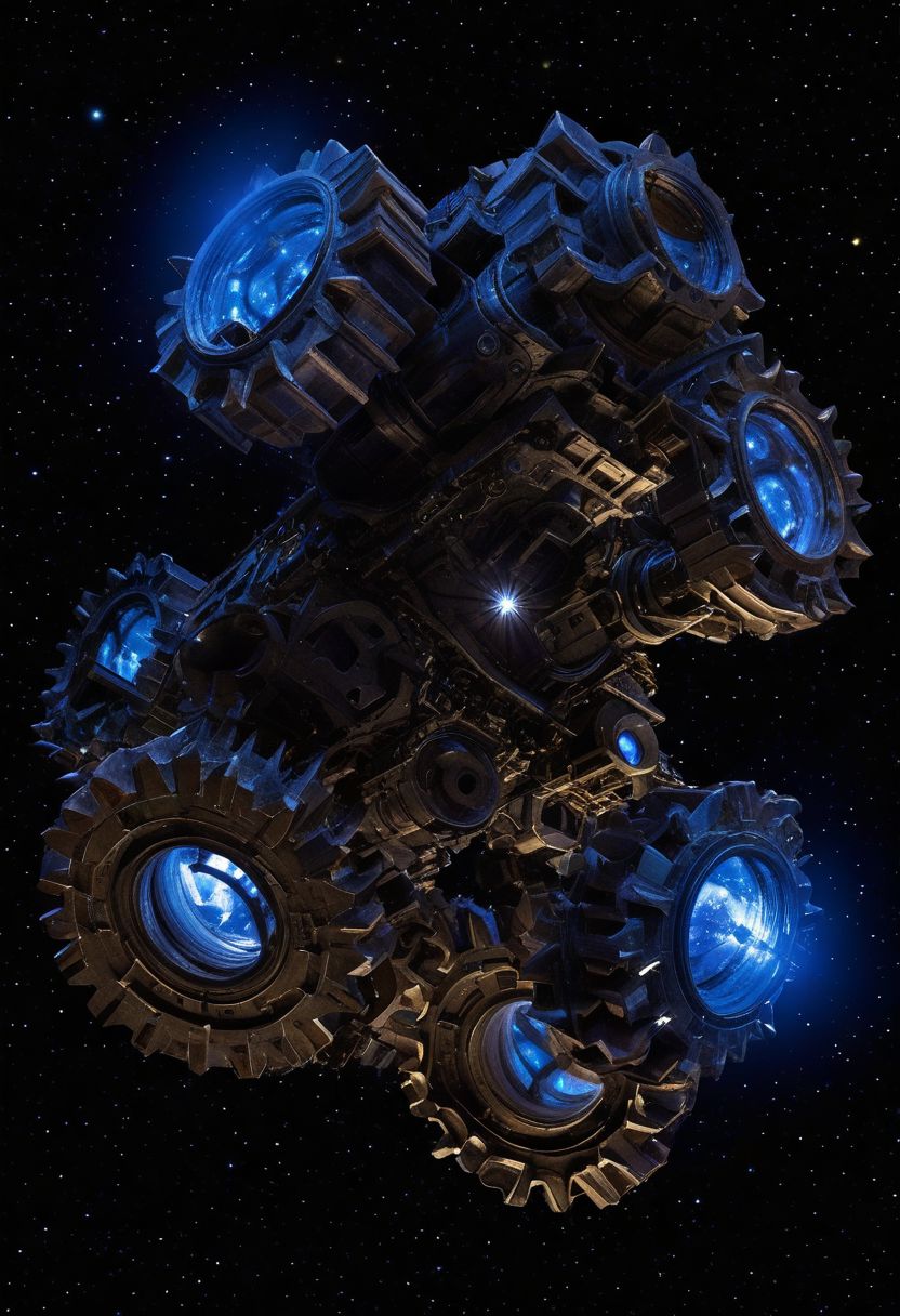 A massive, living gears assembly floating in mid-air, illuminated by a moonless night sky. The individual pieces of the gear troop emit bioluminescent hues,""