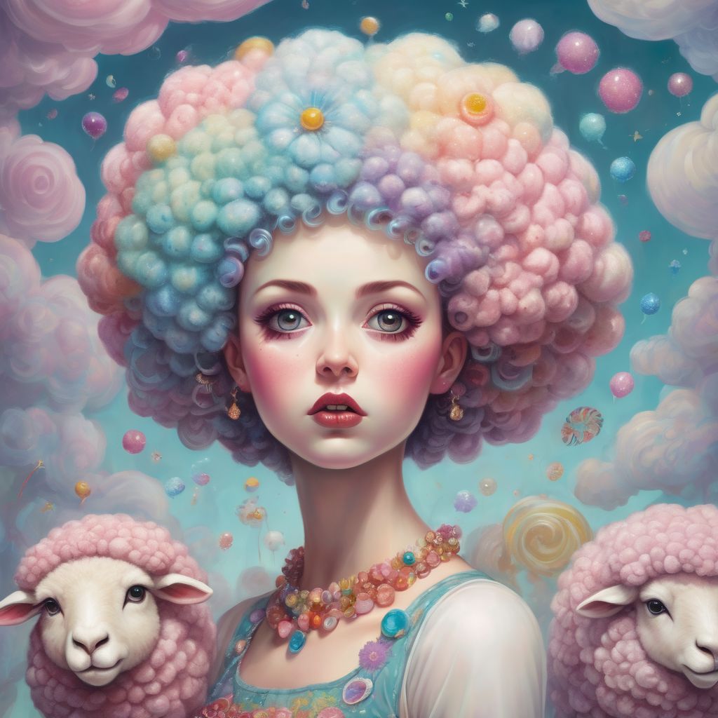 giant fluffy sheep, surprised amused human face, shimmering iridescent pixie dust remnants, pop surrealist style, vibrant candy colors, flat graphic style, minimal background, humorous playful tone, low angle shot, by Mark Ryden, Camilla d'Errico, Takashi Murakami, surreal dreamlike, digital art, high resolution