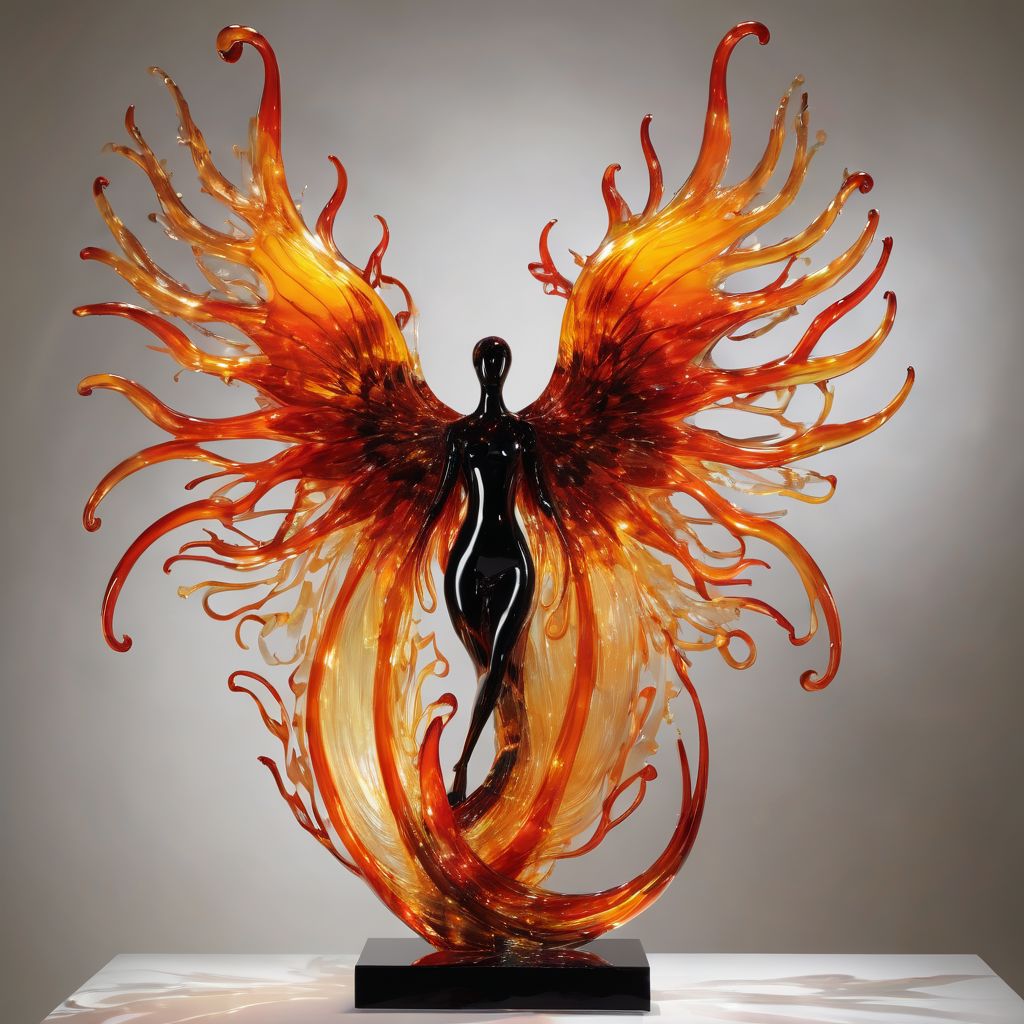 abstract sculpture, molten glass, flowing shapes, fiery colors, Phoenix Empress, wings spread, powerful silhouette, glowing core, radiating heat, intricate details, transparent, translucent, light play, reflections, powerful, feminine, elegant, modern art style, Chihuly inspiration