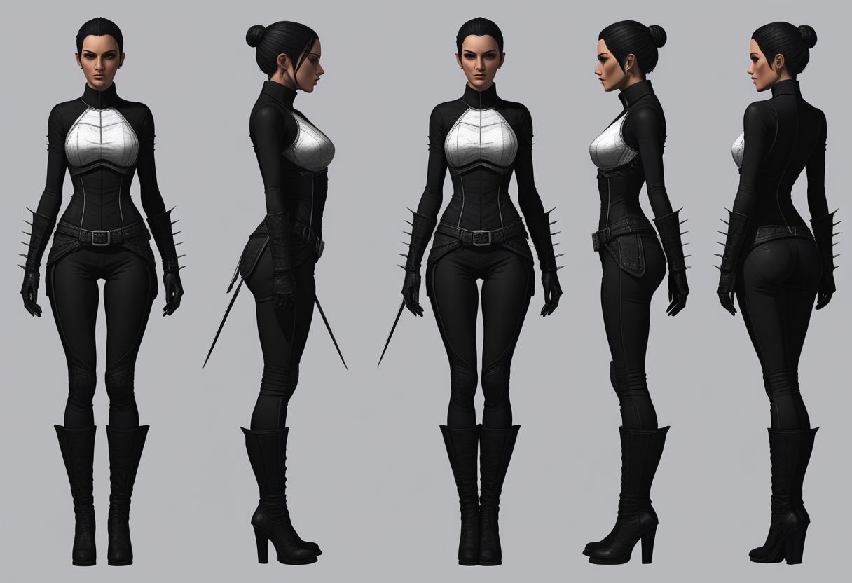 A character reference sheet, for a female assassin, wearing formfitting cloths, Tanzania style, with a biopunk style, full body, turn around, front view, back view, head-to-toe, standing poses, body in frame, hard, delicate, brutal, tough, stiff, crude, octane render, highly detailed, volumetric, dramatic lighting, insanity detailed hands, anatomy illustration, flawless face, perfect face, highly detail face, flawless eyes, perfect eyes