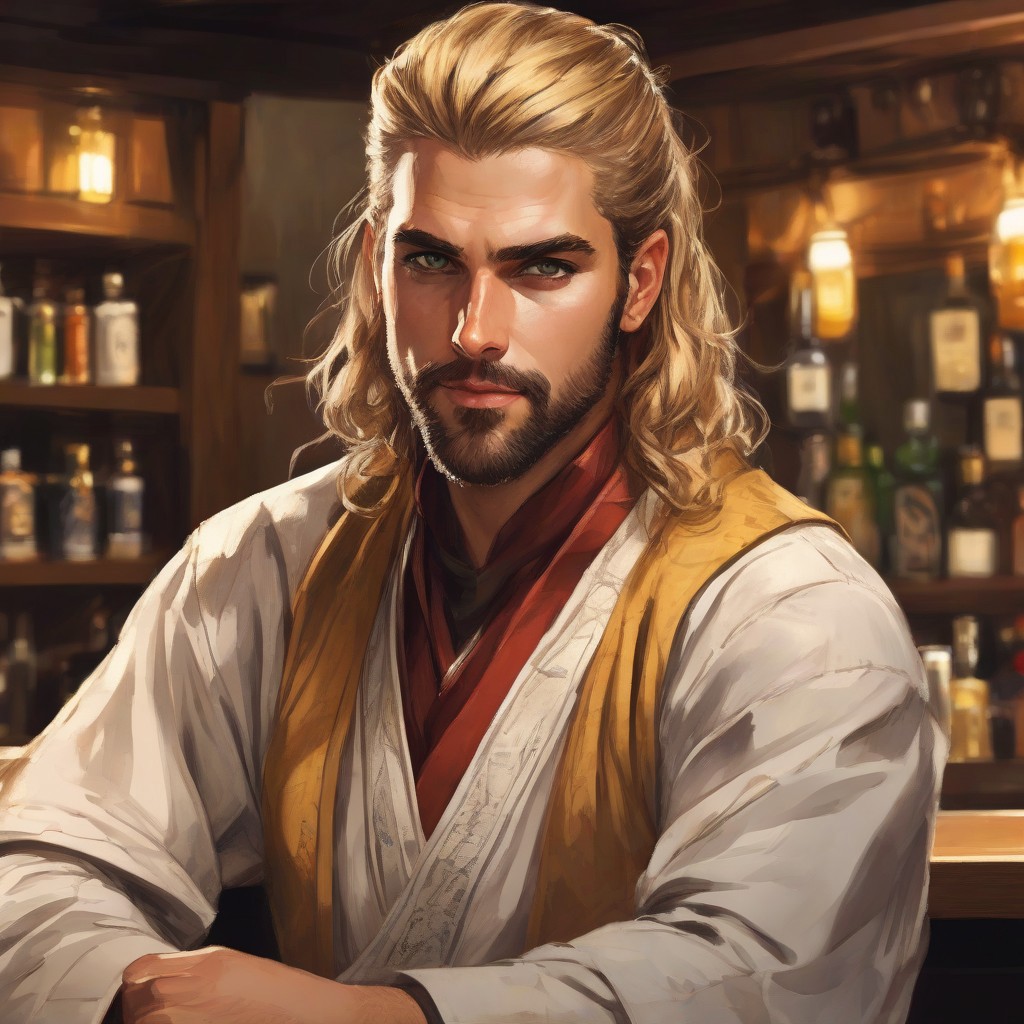 portrait of 1male character, young adult, samurai haircut, samurai ponytail, full beard, visible oil brush strokes, light skin, golden hair, golden beard, green eyes, sitting at the bar, smiling at the camera, welcoming, friendly expression. western facial features