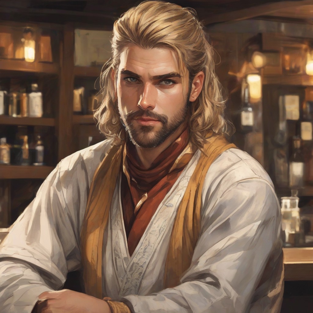 portrait of 1male character, young adult, samurai haircut, samurai ponytail, full beard, visible oil brush strokes, light skin, golden hair, golden beard, green eyes, sitting at the bar, smiling at the camera, welcoming, friendly expression. western facial features