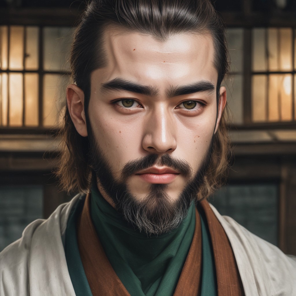 portrait of 1male character, young adult, samurai haircut, samurai ponytail, full beard, visible oil brush strokes, light skin, bronze hair, bronze beard, green eyes