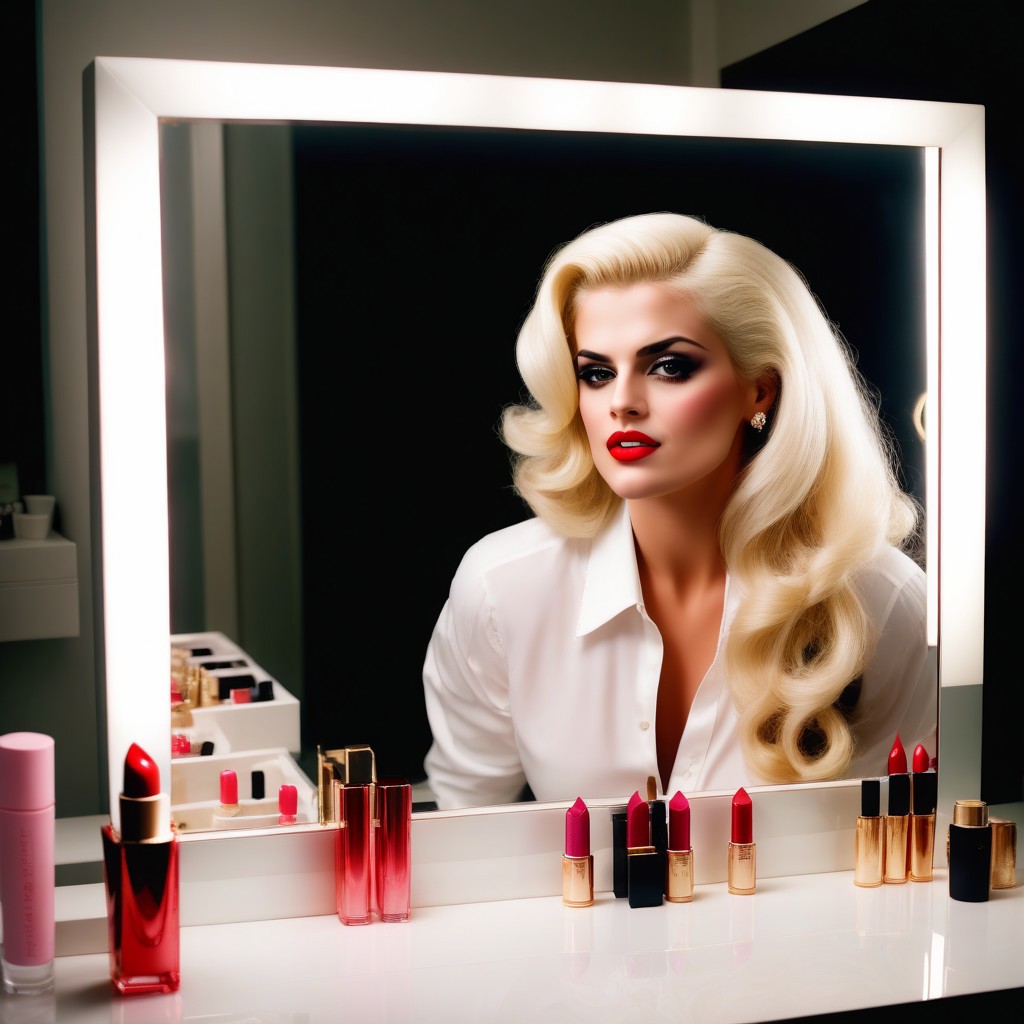 ((( woman is Anna Nicole Smith during her days as a Guess model))), (((bending over and looking in her makeup mirror with proper reflection))) solo, very long straight blonde hair, messy hair, huge eyes, long eyelashes, ((bright red lipstick))), average lips, soft lighting, she is grinning, high contrast, professional shoot, high resolution, RAW format, partial body, 50mm lens,, highly detailed, (((black and white)))