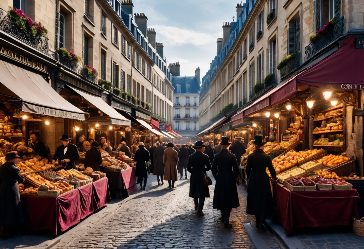Bustling Victorian street market, in Paris, ultra realistic, photorealistic, highly detailed, cinematic lighting, vivid colors, atmospheric background, authentic Victorian architecture, detailed market stalls, realistic textures, dramatic shadows, lifelike expressions, vendors and shoppers, cobblestone streets, period-appropriate clothing, volumetric light effects, dynamic composition, busy marketplace scene, intricate goods and wares, immersive environment, nuanced lighting, vibrant market colors, historical accuracy, high resolution, focus on market activities and street details