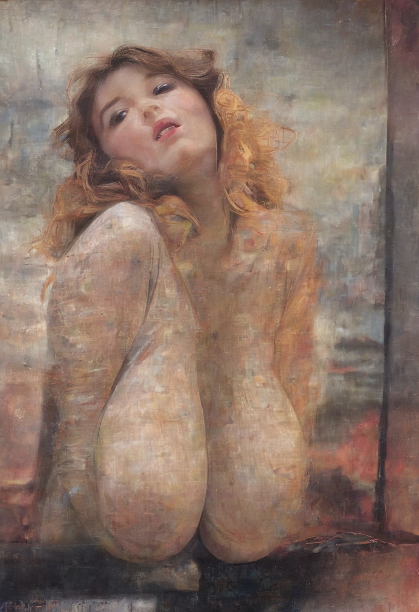 Oil painting by delphin enjolras and dorina costras. A seductive beautiful stunning woman posing completely naked seductively. . Her large tits enormous natural breasts busty gigantic boobs natural breasts hang naturally and her dark nipples are erect and invite the viewer's gaze. She wears a large earrings that catch the light, adding a further come-hither attraction to her passionate seduction. Her long brown wavy curly hair cascades down her back in soft waves, framing her strikingly realistic face. Her brown eyes sparkle with depth and dimension, capturing the viewer's attention.