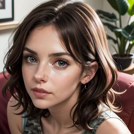 Portrait of Ulla as she is chilling in her living room: 1girl, age:38, caucasian woman, 5'7", 125 pounds, ((light brown wavy hair)), fair skin, (rosy cheeks), hazel eyes, oval face, soft features, straight nose, ((lip piercing)), ((camo tank top)), medium chested, indoors, living room, (closeup portrait,:1.2) blurred background