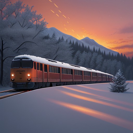 Oil painting on canvas, detailed background, (peaceful snowcapped mountains), ice covered oak trees with no leaves, snow on the ground, beautiful view, holly, mistletoe, early morning, sunrise sky, orange clouds, red sky, dappled sunlight, beautiful, train tracks in the snow, bird's nest, dead tree, depth of field, illustration, perfect composition, intricate details, absurdres, moody lighting, wisps of light, no humans, (baroque style: 0.8), (Bob Ross style: 0.6)