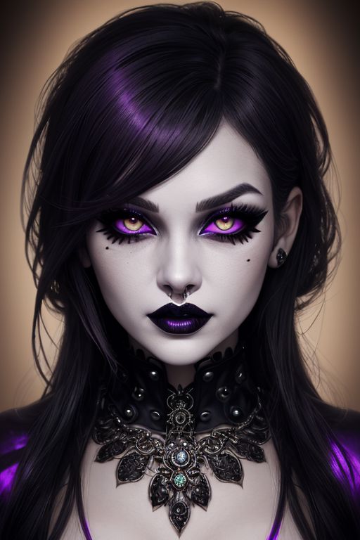 glamour photography of a evil demon goth girl, edgy vibe, dark, mascara, eyeliner, purple dragon eyes, ornate jewelry, smoky eye makeup, full narrow lips, narrow face, white teeth, skin pores, shiny skin, grainy, harsh flash lighting, sepia tone