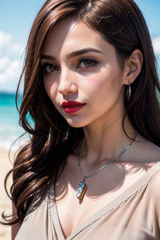 Portrait of Thania, 1girl, age:37, 5'6", 150 lbs, long curly hair, red hair, fair skin, gray eyes, thick slanted eyebrows, upturn nose, thick lips, pink lipstick, silver necklace, yellow blouse, low neckline, medium chested, (close-up:1.4), outdoors, beach, blurred background.