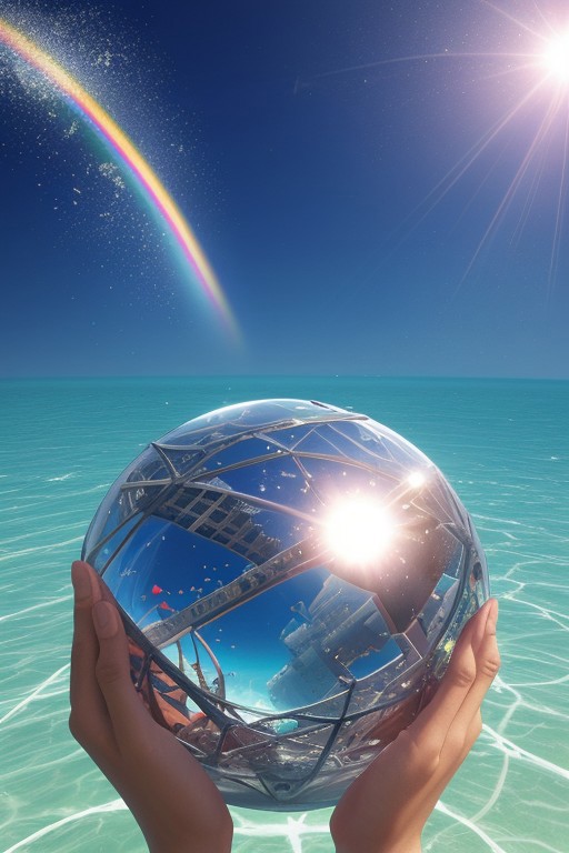 ([by Buckminster Fuller|by Santiago Calatrava]:1.5), (Giant Metal Orb.:0.5), floating metal sphere, open ocean, dolphins, rainbow, sunny day, lens flare