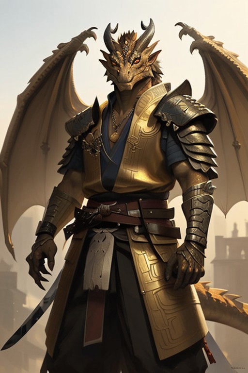 golden scaled dragonborn, solo, male, jewelry, closed mouth, orange eyes, male focus, wings, horns, belt, sword, necklace, samurai armor, s, claws, , ((masterpiece, best quality)), art by greg rutkowski <lora:dragonborn_offset:1>