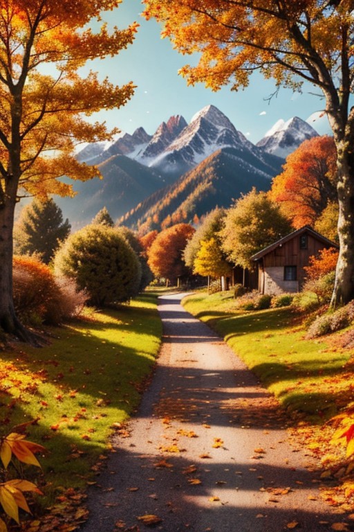 capture the view of autumn trees covered with ton of leaves(ultra detailed treeand leaves,8K HDR),leaves falling,smooth lighting,smooth wind,wast land,long view of mountains,a little village (ultra detailed),some houses(ultra detailed),joyful view,birds flying,((4K HQ)) ((8K HDR photo)),ultra detailed image,HD image,well detailed surroundings,single image.
