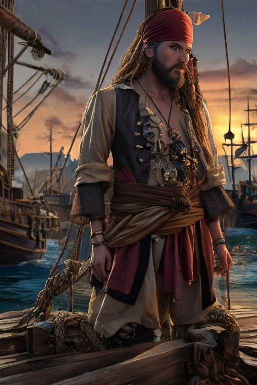 (masterpiece:1.2), (best quality,:1.2), 8k, HDR, ultra detailed, ((photorealistic)), professional light, cinematic lighting, fashion photography, ambient lighting, atmospheric effects, <lora:detail_slider_v4:2>, <lora:zoom_slider_v1:4>, a (male) pirate, long hair, beard, <lora:PirateGarb:0.5>, in a pirate harbor on a pirate island, <lora:PirateRealms:0.8>, PiRe, epiCPhoto