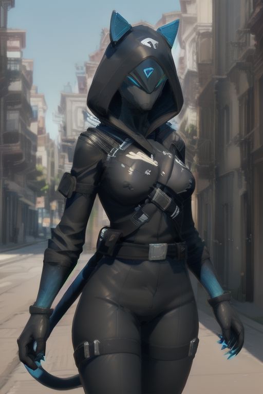 woman, mask, black leather outfit, cat woman, blue eyes, blue ears, 4k, no blur