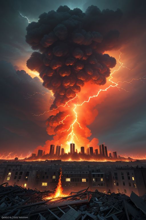 <lora:ChaosEngine-v1:0.4> a burning city, layers of buildings and (red fire lightnings raining down and rubble set on fire), view from below, (suspended above ground), ultra realistic, 4k textures, dutch angle, dolly zoom, lens flare, laser hitting building