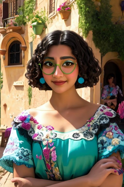 <lora:Mirabel Madrigal_v1:1> mirabel madrigal, green glasses, upper body, smirk
