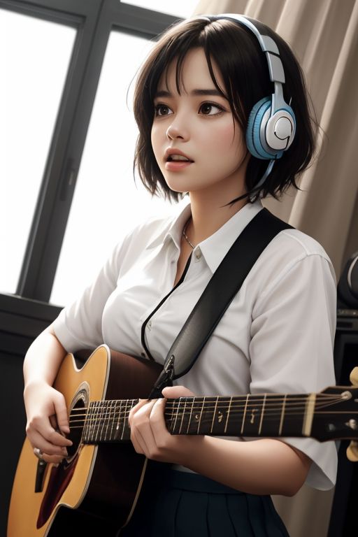 mobile photo, A cute pop singer (young woman) with short hair and symmetrical teary eyes holds a guitar and sings into headphones, wearing a pleated skirt, with a dynamic angle, exuding a melancholy emotion, soft glow of mid-day lighting, haze, atmosphere, humid, cartoon, disnay pixar