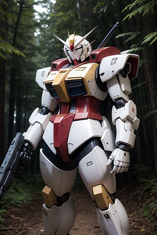 very fat Gundam, solo, looking_at_viewer, blue_eyes, standing, no_humans, glowing, very fat robot, very fat mecha, glowing_eyes, clenched_hands, science_fiction, straight-on, v-fin, very fat mobile_suit, cinematic lighting, strong contrast, high level of detail, Best quality,masterpiece, in a forest,<lora:gundam_Transparent:0.7>,