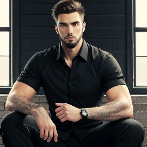 insanely attractive 27 year old male model, wearing black shirt, wearing black watch, folded sleeves, shirt buttons open, trimmed beard, sharp jawline, muscular body, sitting posing for a camera