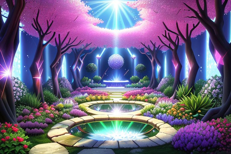 A garden where all the plants are made of various types of crystals, reflecting and refracting light in dazzling ways. The interplay of light and color creates a stunning visual spectacle.