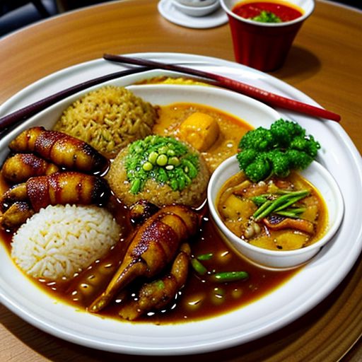 A vibrant and mouth-watering spread of traditional Singaporean food displayed on a rustic wooden table. The scene includes iconic dishes such as Hainanese chicken rice, laksa, satay skewers, chili crab, and a bowl of hot and spicy bak kut teh. Freshly cut lime, a side of sambal chili, and an array of colorful vegetables accompany the dishes. The background features a typical hawker center setting with people enjoying their meals, adding a lively and authentic atmosphere to the scene. The lighting is warm and inviting, highlighting the rich textures and colors of the food. Traditional, vibrant, mouth-watering, iconic, colorful, authentic, lively, warm, inviting, rich textures, hawker center