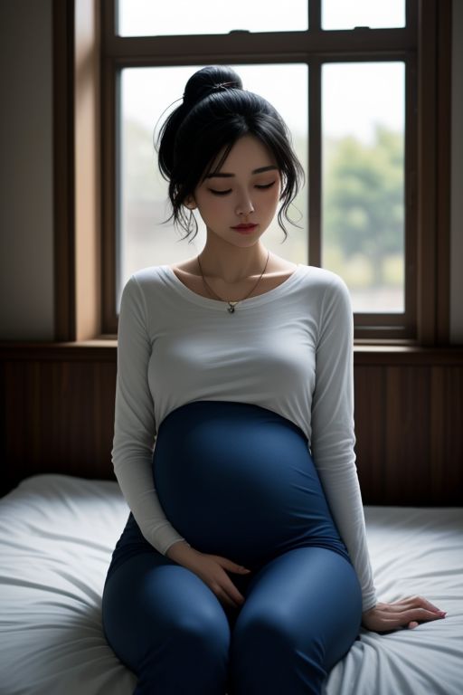 Abandoned building, white sheets on the floor by the window, a pregnant woman with a black ponytail, earrings, a necklace, a red long-sleeved T-shirt, blue trousers, and a white fringed shawl with blue and red patterns (covering the entire upper body) , sitting on the sheets, eyes closed. FHD, masterpiece, realistic style.
