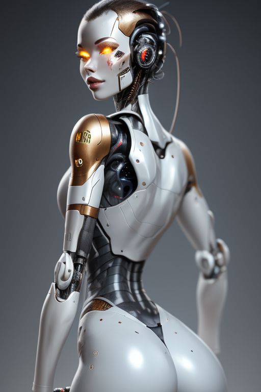 Cyborg, navel, Luminous eyes, colored skin, cyberpunk background, portrait, science fiction, ass, 1girl, gun, realistic