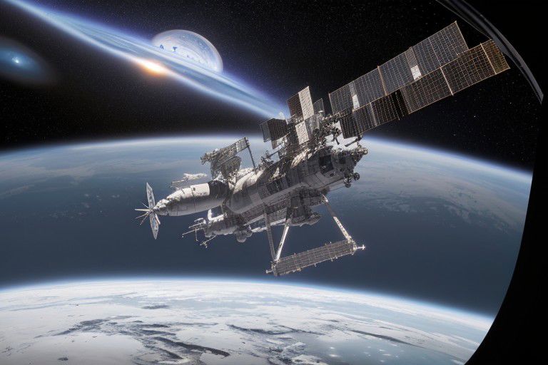 in orbit around a blue gas giant exoplanet, in cockpit view of spaceship, dark space with some stars in front, only 1 planet visible, see small ships and a space station in the distance, space plane orbiting, planet ring in view