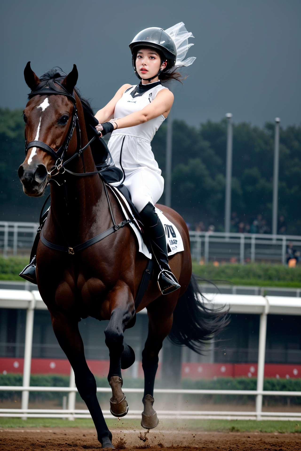 a girl jumping over obstacles on a black horse. she is wearing a helmet and an dress. the racetrack is raining. the girl has a tense face,showing determination, (masterpiece photography),(best quality),(reality),((highres)),