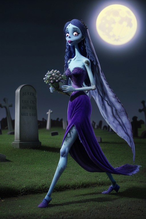 The Corpse Bride walking through a cemetery on a moonlit night. Velvet purple full length dress, Light-blue skin, big eyes, big lips, tiny nose, blue mascara, blue hair, sultry, forlorn, looking at camera