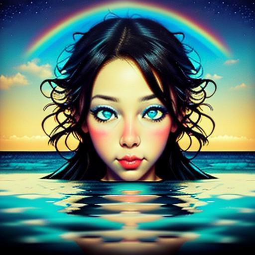 beautiful girl eyes with rainbow eye with sea and beach reflection, in the style of chinapunk, reflections, in the style of John Berkey