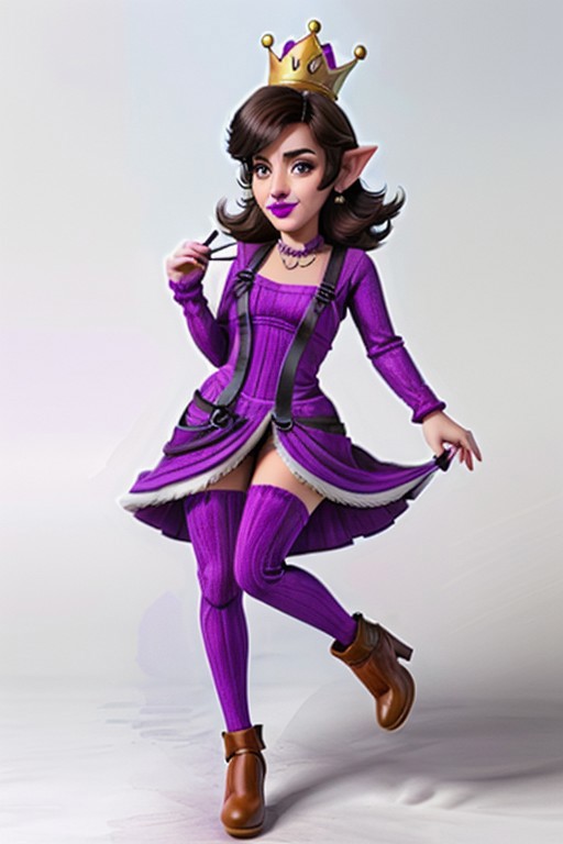 gender transformation, mtf, sequence, full body, simple background, standing, super crown, waluigi, waluette, princess dress, red clothes with blue highlights, long hair, pretty face, detailed face, detailed figure, Makeup, feminine features, dark brown hair, photorealistic, feminine face, subtle makeup, gender bent waluigi, full body render, upside down L logo, purple clothes with yellow accents, pointy ears, suspender-like accents, yellow upside down L on clothes, long and pointy nose