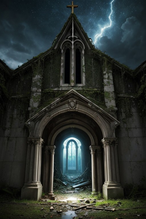 masterpiece, best quality, absurdres, illustration, photorealistic, 1other, monster, eldritch monster, tentacled monster emerging, glowing portal, abandoned church, ancient symbols, chaotic energy, dark skies