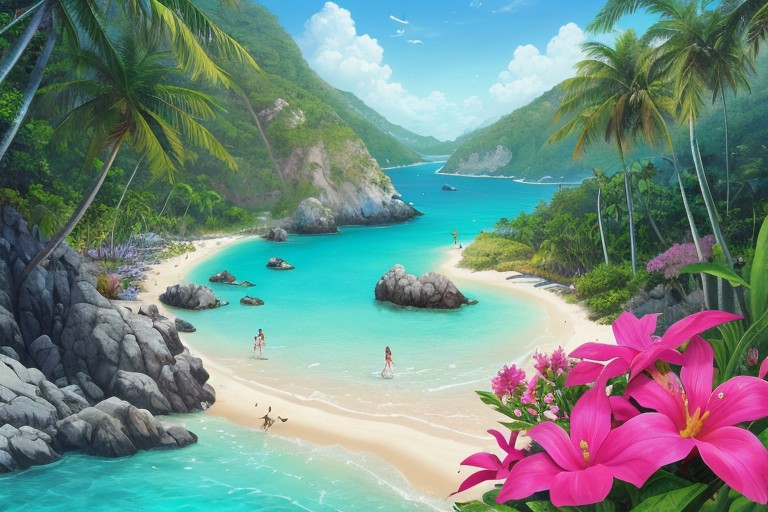 score_9, score_8_up, score_7_up, score_6_up, best quality, masterpiece, detailed, An epic tropical beach with turquoise water and a forest full of flowers.