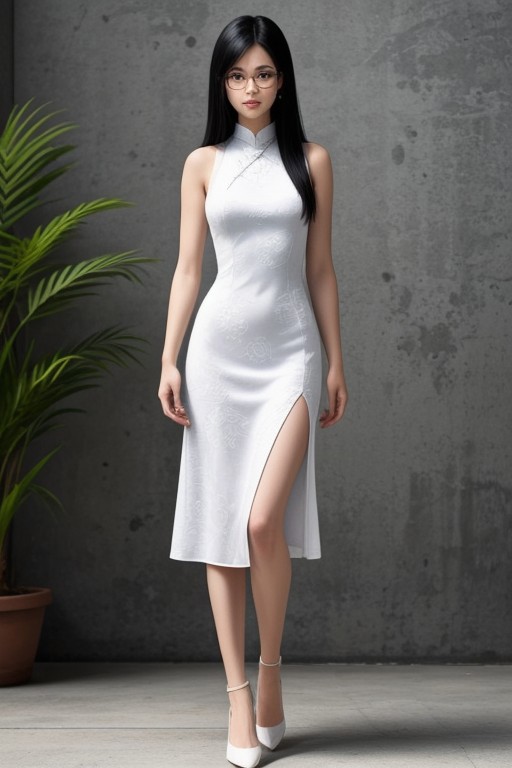 A female with long straight black hair and no bangs on her forehead. Wear black frame glasses. Wear a white sleeveless cheongsam with an orchid pattern and white high-heeled sandals. FHD, masterpiece, realistic style.