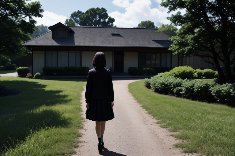 A female with a black bob haircut and bangs on her forehead. Wearing a simple headband without decoration, a white long-sleeved shirt with a red bow on the collar, a black pleated skirt, white socks, and black leather shoes. Her (front view) eyes are closed, her neck is bent to the side, and she is fixed on a cross. The cross was erected in the front yard of a Japanese-style two-story house, and the grass beneath the cross was piled with firewood. A town resident (back view) walks towards her holding a burning torch. FHD, masterpiece, realistic style.