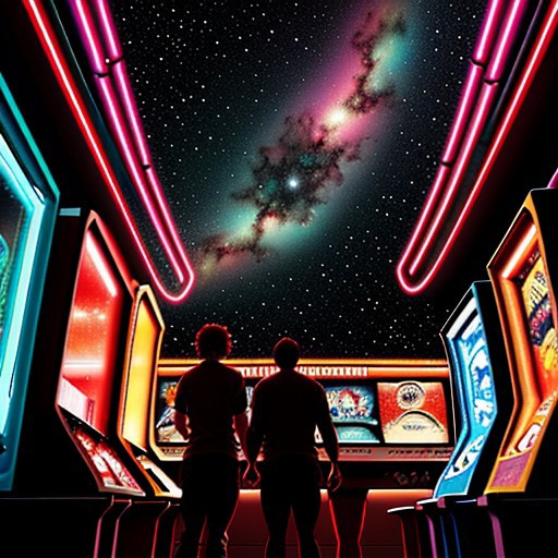 A mesmerizing 1980s-themed bedroom illustration featuring a teenage boy and girl, both wearing brightly colored tracksuits. They stand side by side, gazing in awe at a wormhole that has appeared in the wall. The wormhole is a dazzling, swirling vortex of vibrant colors, set against a celestial backdrop of twinkling stars and serene nebulas. Surrounding them is retro furniture, including a neon-lit arcade cabinet called Invaders, and iconic movie star posters of Rambo, Predator, and Freddy Krueger. The atmosphere in the scene is a blend of wonder and excitement, as the boy embarks on an extraordinary journey through space and time, ready to explore the unknown.