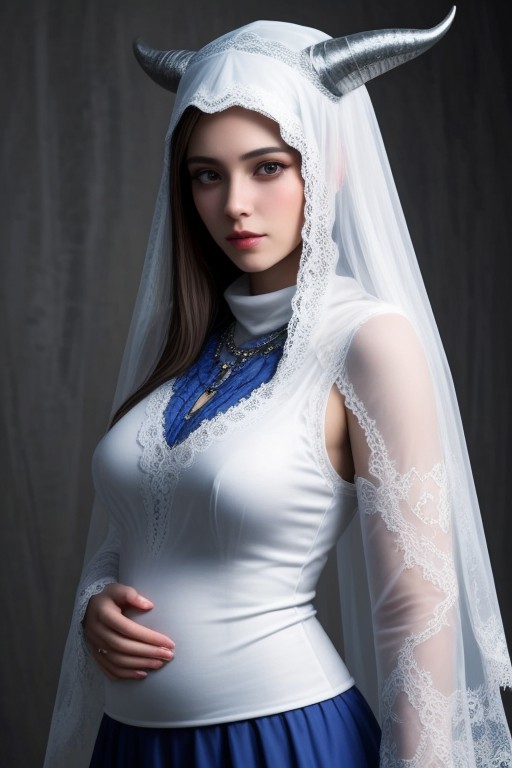 A pregnant woman wearing a blue Arabian hat (there is a silver hat with sapphires in the center of the front and three silver horns in total, one in the center of the top of the hat and the other two at the left and right ends of the hat), with all her hair hidden in the hat. , a white veil covering the silver horn on the top of the hat to cover the back of the head, a white long-sleeved lace shirt, a blue sleeveless jacket, a white scarf, a silver necklace, and a blue skirt. FHD, masterpiece, realistic style.