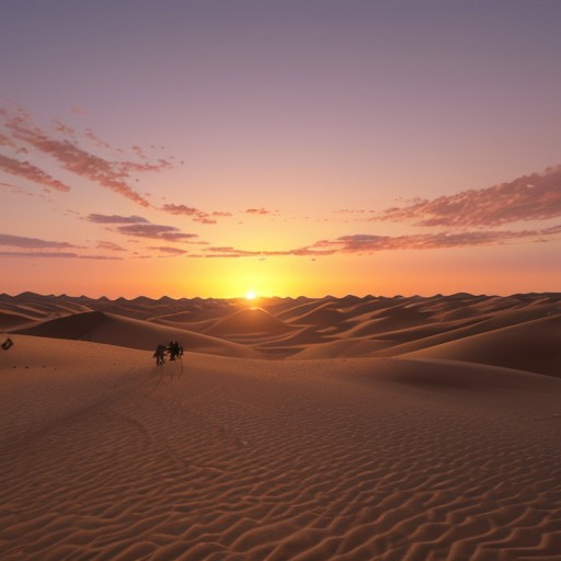 A vast desert landscape at sunset, with towering sand dunes and a vibrant orange sky. In the foreground, an ancient, abandoned temple partially buried in the sand, its intricate carvings still visible. A caravan of nomads with camels is silhouetted against the setting sun, and in the distance, a mirage of an oasis shimmers under the golden light
