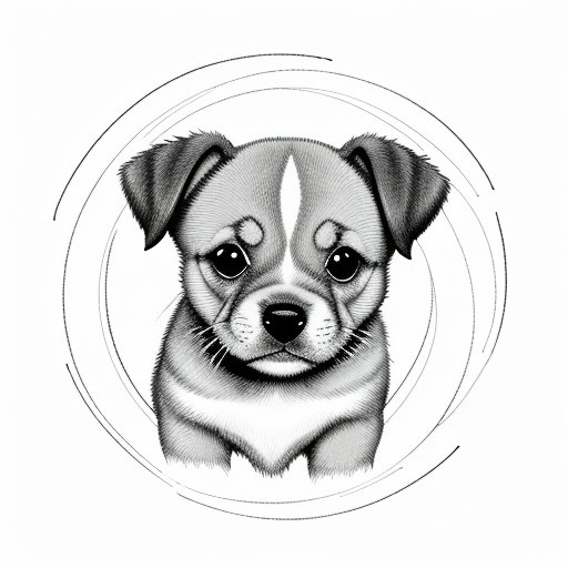 Puppy in the style of anime. Simple lines, fast lines, blurred lines, pencil lines. White background. Black and White.