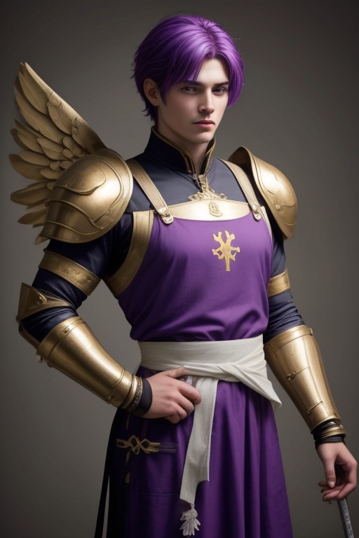 The male angel Raphael has a golden punk hairstyle, no bangs on his forehead, purple skin and a pair of purple angel wings. He wears a full set of blue plate armor, with only his upper arms and palms exposed. He wears a white apron over the plate armor. The upper part of the apron covers the left shoulder to the right waist, the lower part of the apron covers the waist to the ankles, and the lower part of the apron is printed with a gold cross pattern. Holding a sword in hand. FHD, masterpiece, realistic style.